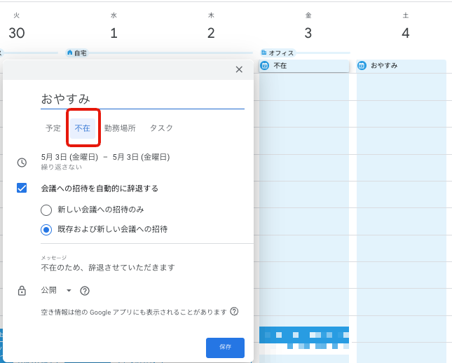 Google Workspaceを利用されている方は、カレンダーの設定を終日「不在」に設定してください。