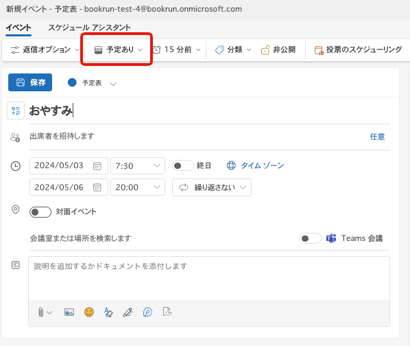 例:営業時間の時間帯にステータス「予定あり」で予定をいれた場合