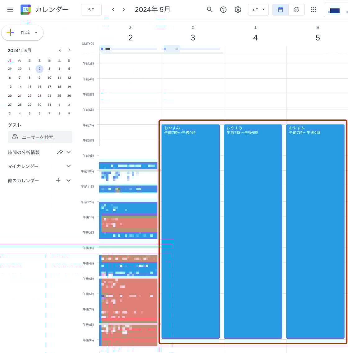 bookrunの仕様上、カレンダーへ「終日予定」として設定をしても、ブックボード(日程調整用カレンダー)には空き時間(◎)として表示されてしまいます。