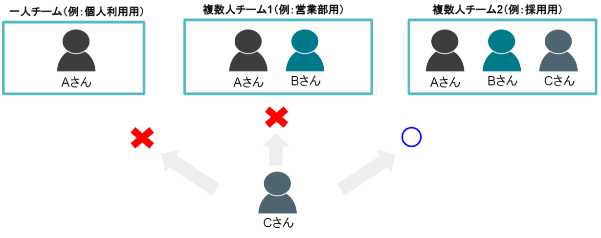 一つのアカウント(Aさん)は複数のチームに所属することが可能です。